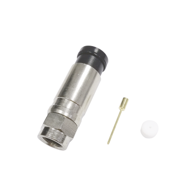 RadiocomunicaciónConector F Macho de Compresión Axial con Borne Negro para instalar en Cable Coaxial RG-11, 75 Ohm, Bronce-Niquelado.